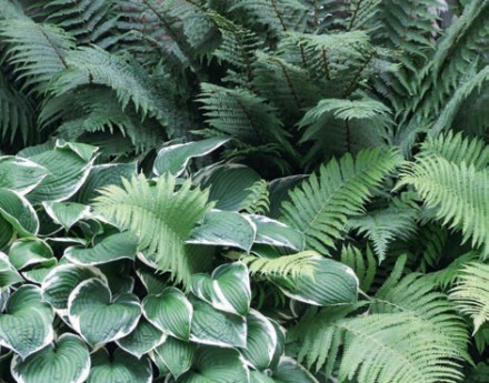 Planując rabaty czy inne nasadzenia w cieniu, warto sięgać po rośliny o zróżnicowanej wysokości. Niższe i barwniejsze warto usytuować bliżej ścieżek, natomiast wyższe oraz jednolite kolorystycznie wykorzystajmy jako ich tło. Duży wpływ na atrakcyjność aranżacji mają kształt, pokrój, faktura i kolorystyka liści oraz barwa kwiatów czy owoców – jasne i soczyste odcienie rozświetlą i ożywią tonące w mroku zakątki ogrodu. Godne uwagi są cieniolubne byliny. Te z grupy zadarniających będą pięknie wyglądać pod drzewami oraz tam, gdzie nie ma szans na bujny trawnik. Mogą to być barwinek pospolity, bluszcz pospolity, dąbrówka rozłogowa czy gajowiec żółty i konwalia majowa. Na rabaty z długiej listy cieniolubnych bylin warto wybrać funkie, paprocie, bergenię sercowatą, fiołek wonny, dziurawiec, tawułkę Arendsa oraz ciemierniki. Ich ozdobą będą też kosaciec syberyjski, szafirki czy jaskier ogrodowy oraz zawilec leśny. W budowaniu kompozycji dobrze jest wykorzystać pnącza np. bluszcz pospolity, niektóre odmiany powojników czy kokorniak wielkolistny. Zakątki wymagające rozjaśnienia ozdóbmy kwitnącymi na biało przywarką japońską lub hortensją pnącą. W cieniu świetnie sobie poradzą liczne krzewy i drzewa. Do bardzo ozdobnych należą cisy: pospolity i pośredni. Okazy żeńskie obsypują jaskrawoczerwone nasiona pięknie kontrastujące z zielenią igieł. Chętnie wykorzystywane są także mahonia pospolita, laurowiśnia wschodnia, azalia japońska, hortensje – bukietowa, dębolistna i ogrodowa – czy kalina sztywnolistna.