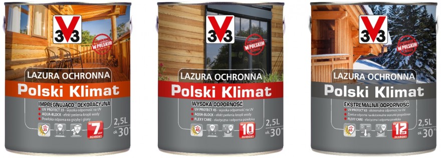 W produkcji Lazur V33 z gamy Polski Klimat zostały zastosowane dwie technologie – Aqua Block i Flexy Care, które skutecznie radzą sobie z pogodowymi wyzwaniami. Utworzona przez lazury powłoka jest hydrofobowa, dzięki czemu krople wody nie wnikają w głąb drewna, lecz spływają po jego powierzchni.  Powłoka tworzona przez te lazury jest też elastyczna - pracuje wraz z drewnem podczas zmian objętościowych, zabezpieczając jednocześnie drewno przed powstawaniem mikroszczelin i wnikaniem wody.